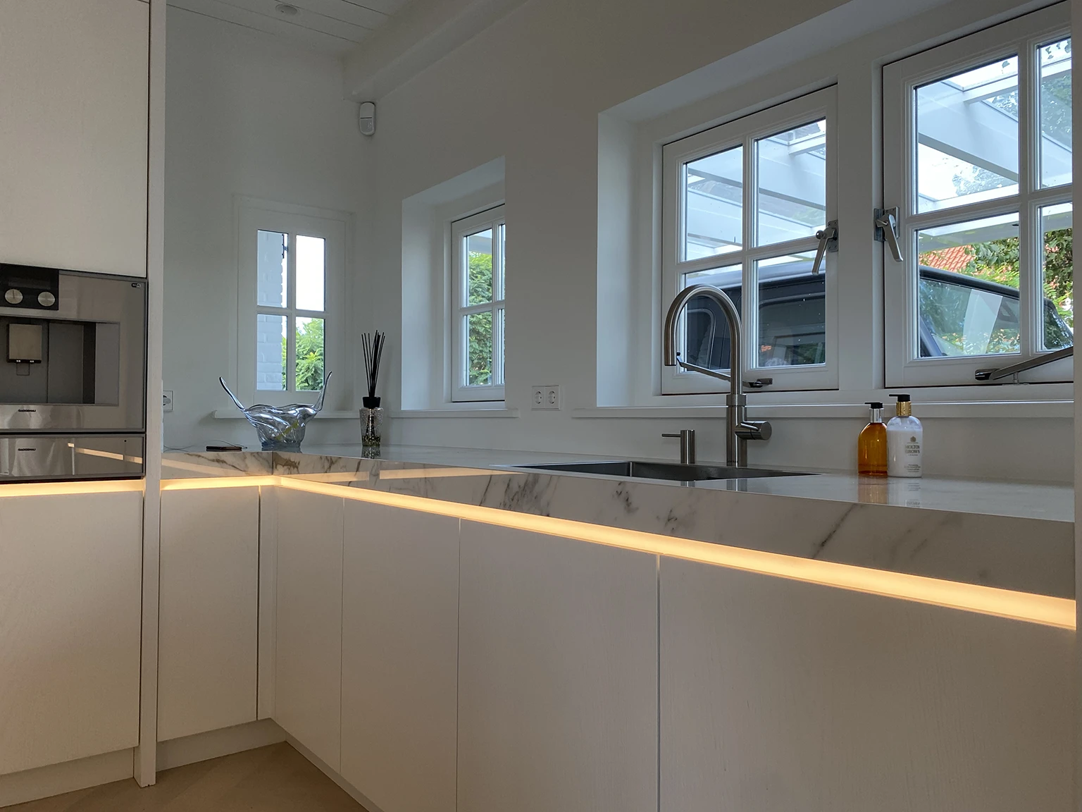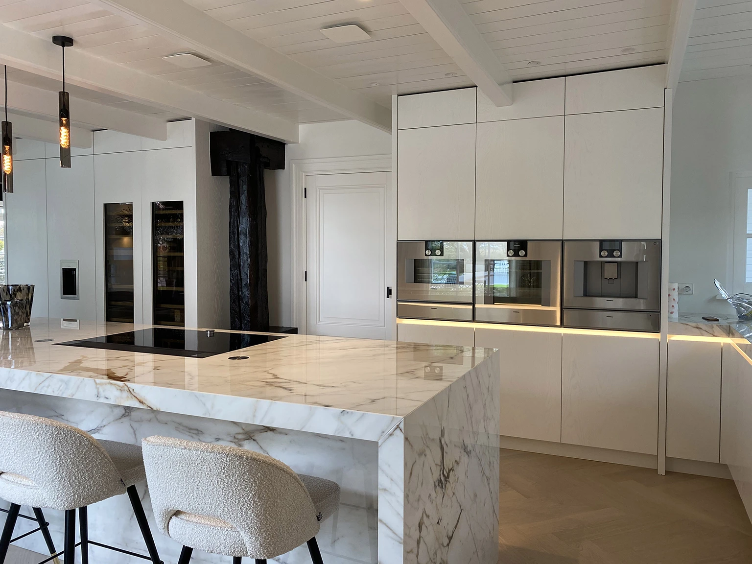 De verbouwing van de inloopkast, open keuken en eetkamer volledig aangepast met hoogwaardige materialen en een strak design. Voor de inloopkast zijn op maat gemaakte kasten en verlichting geplaatst, de keuken is voorzien van moderne apparatuur, marmeren werkbladen en stijlvolle verlichting, en de eetkamer is vernieuwd met een warm, minimalistisch interieur en een perfecte afwerking.